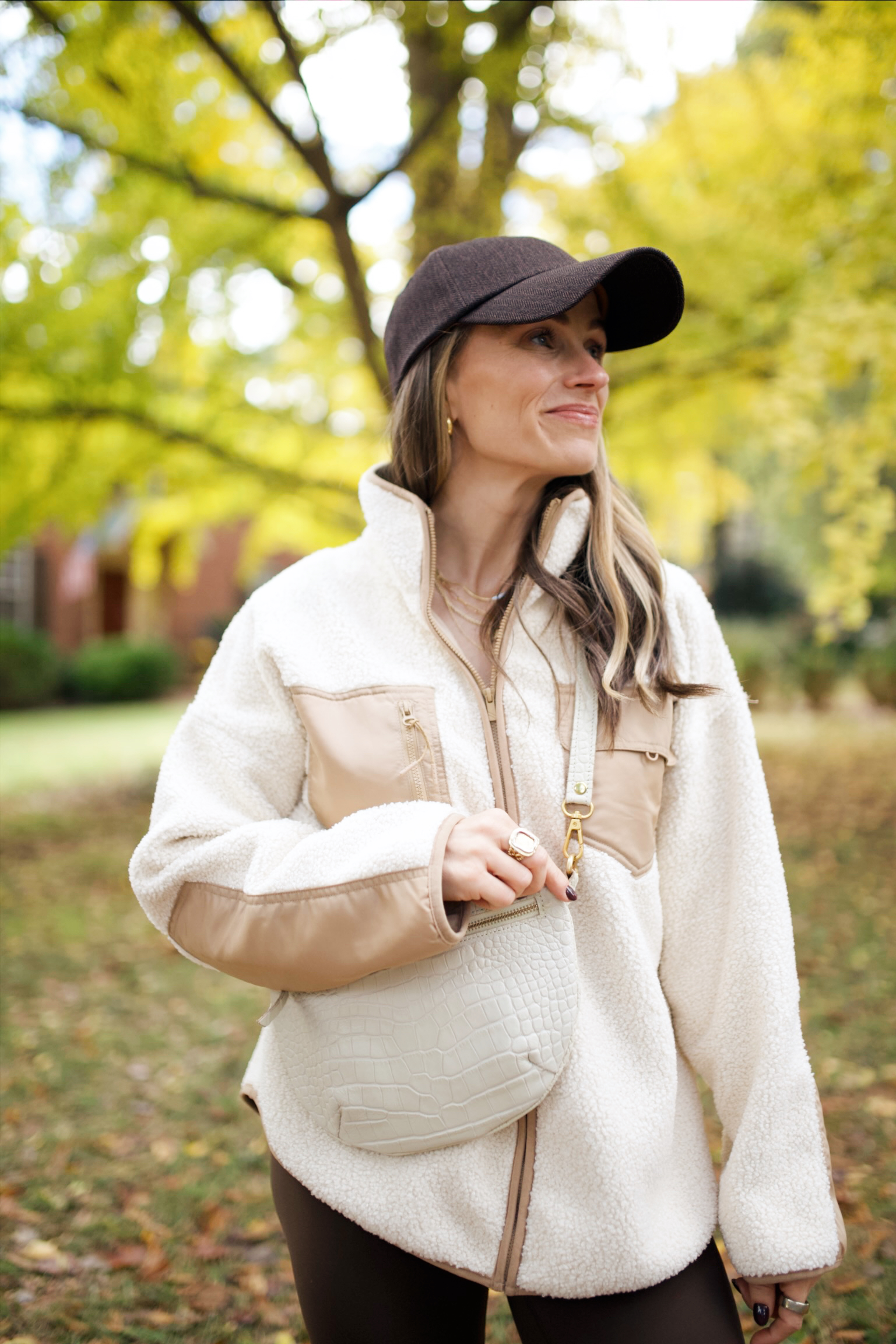 A cozy layer instantly elevates any athleisure look. Try draping a pullover over your shoulders or adding a cropped puffer or fleece jacket when it’s cold. This is the fleece from Tuckernuck I’m pictured in at the top of this post. So cute and cozy.