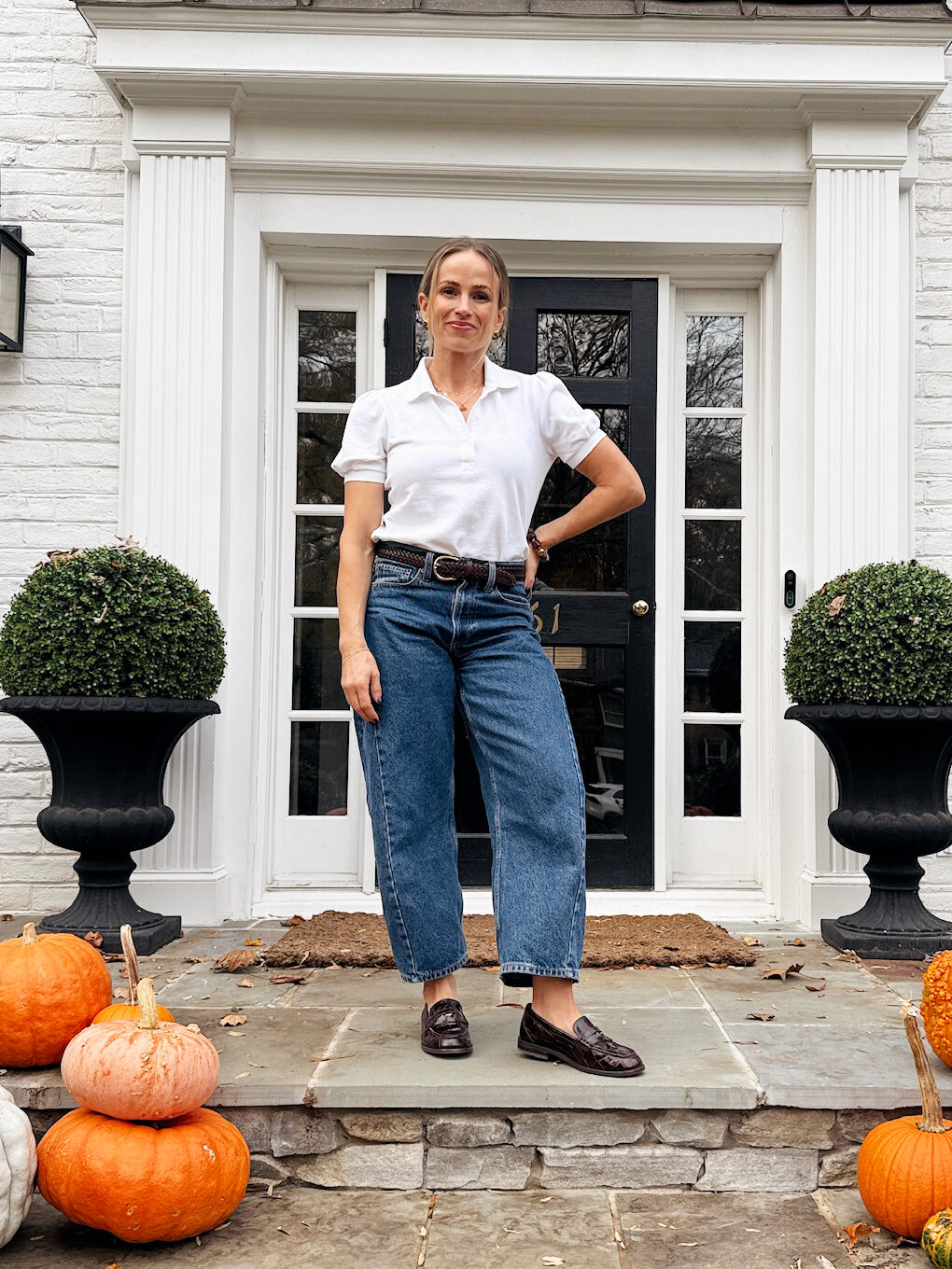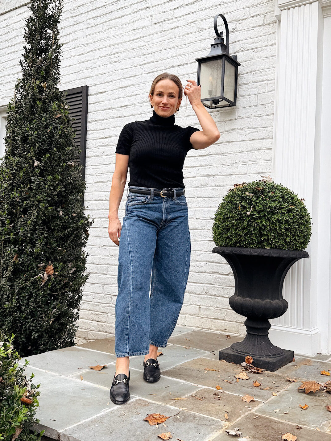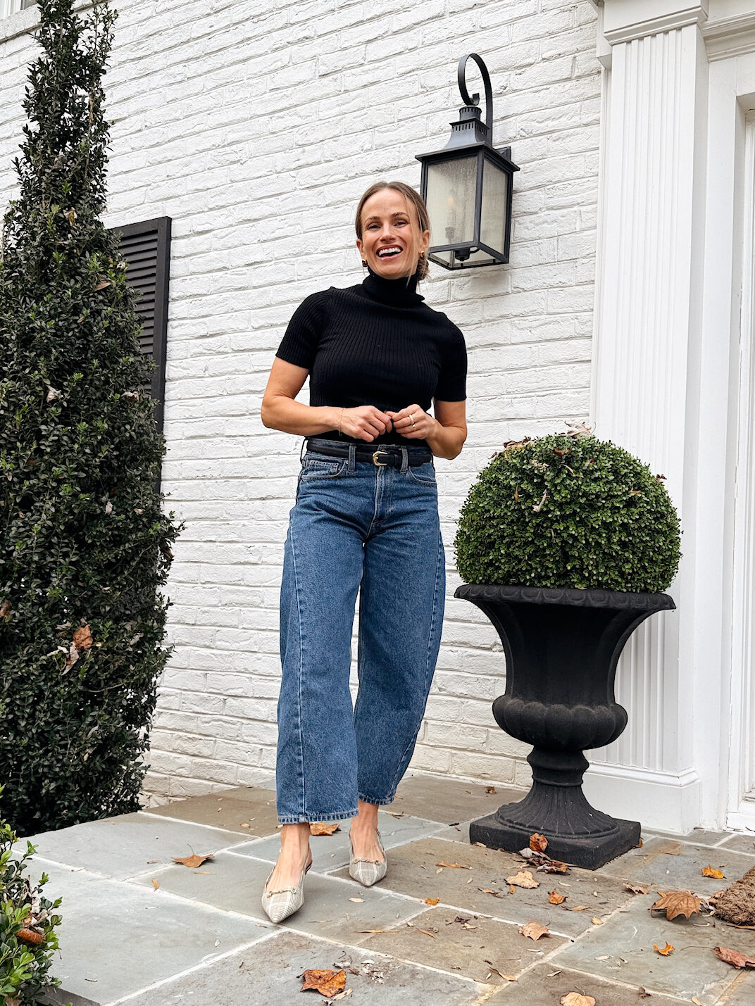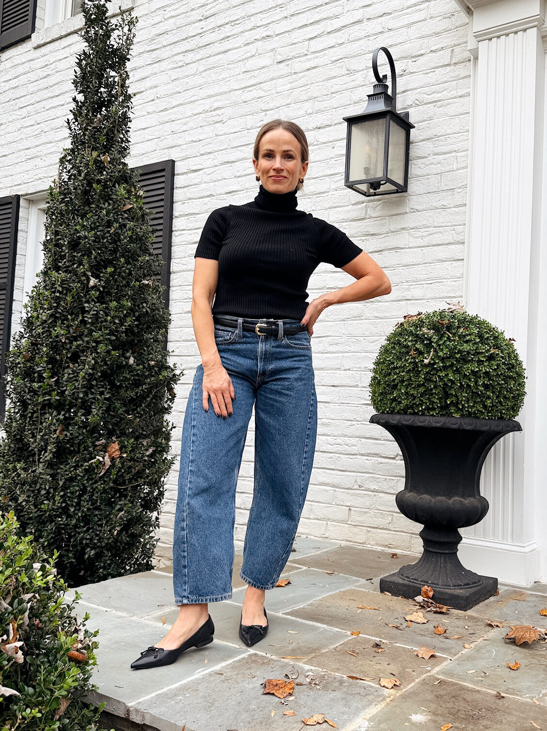 Ballet flats are an easy win with barrel jeans. The narrow profile keeps the ankle clean and polished and they’re a classic, polished style. A leather or suede pair looks timeless, especially with a simple tee and blazer. I personally love my Larroude suede ballet flats or these Tuckernuck Nadia flats (if I don’t want a strap).