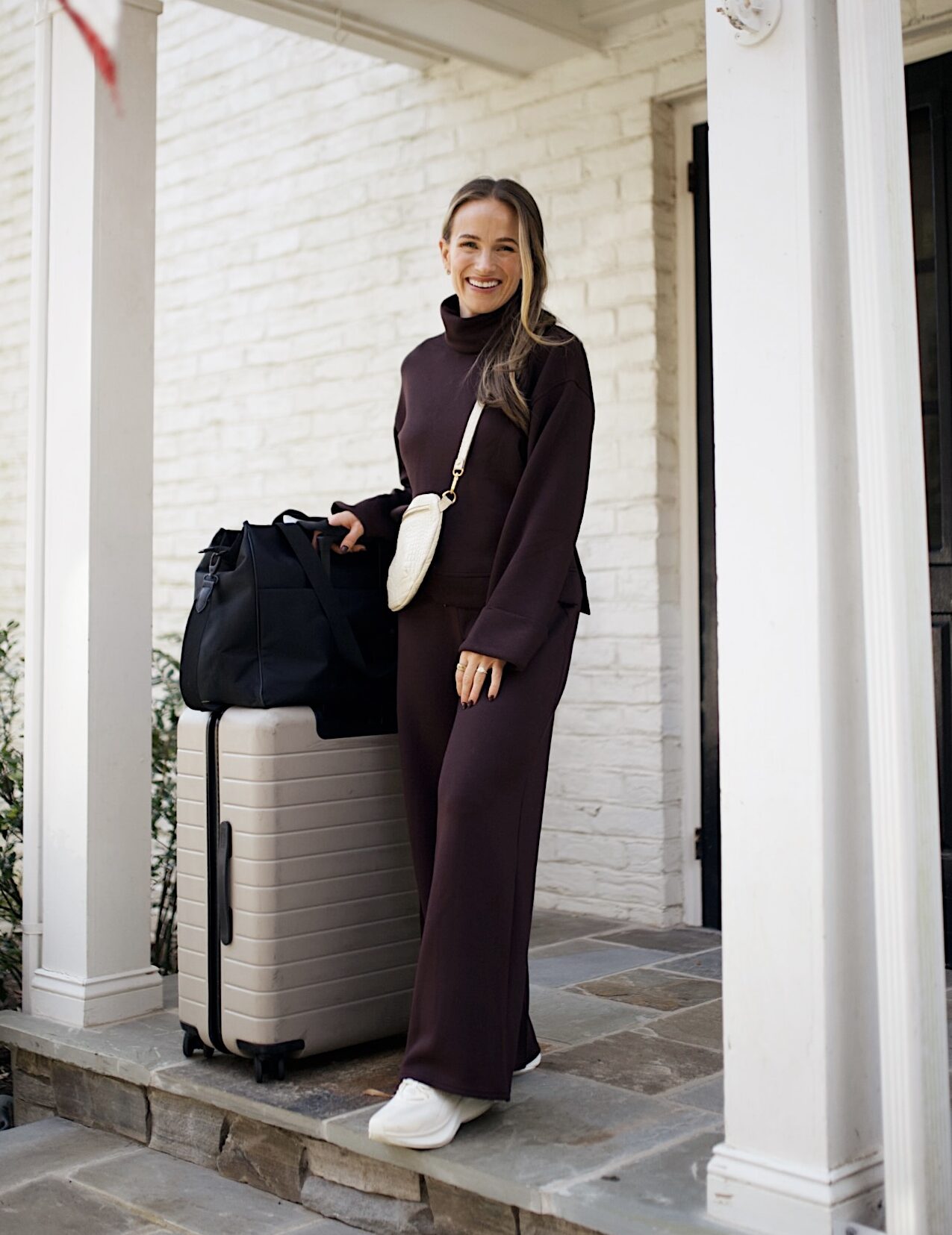 A matching Spanx set or a neutral sweat set is always my go-to for travel. It looks intentional, feels like loungewear, and layers perfectly with a trench or longline jacket. I wear this for daytime flights, but we all know a sweat set is perfect for long overnighters too. This sweat set is much more elevated than oversized, sloppy sets, especially with their more structured tops so you can look polished without sacrificing comfort.