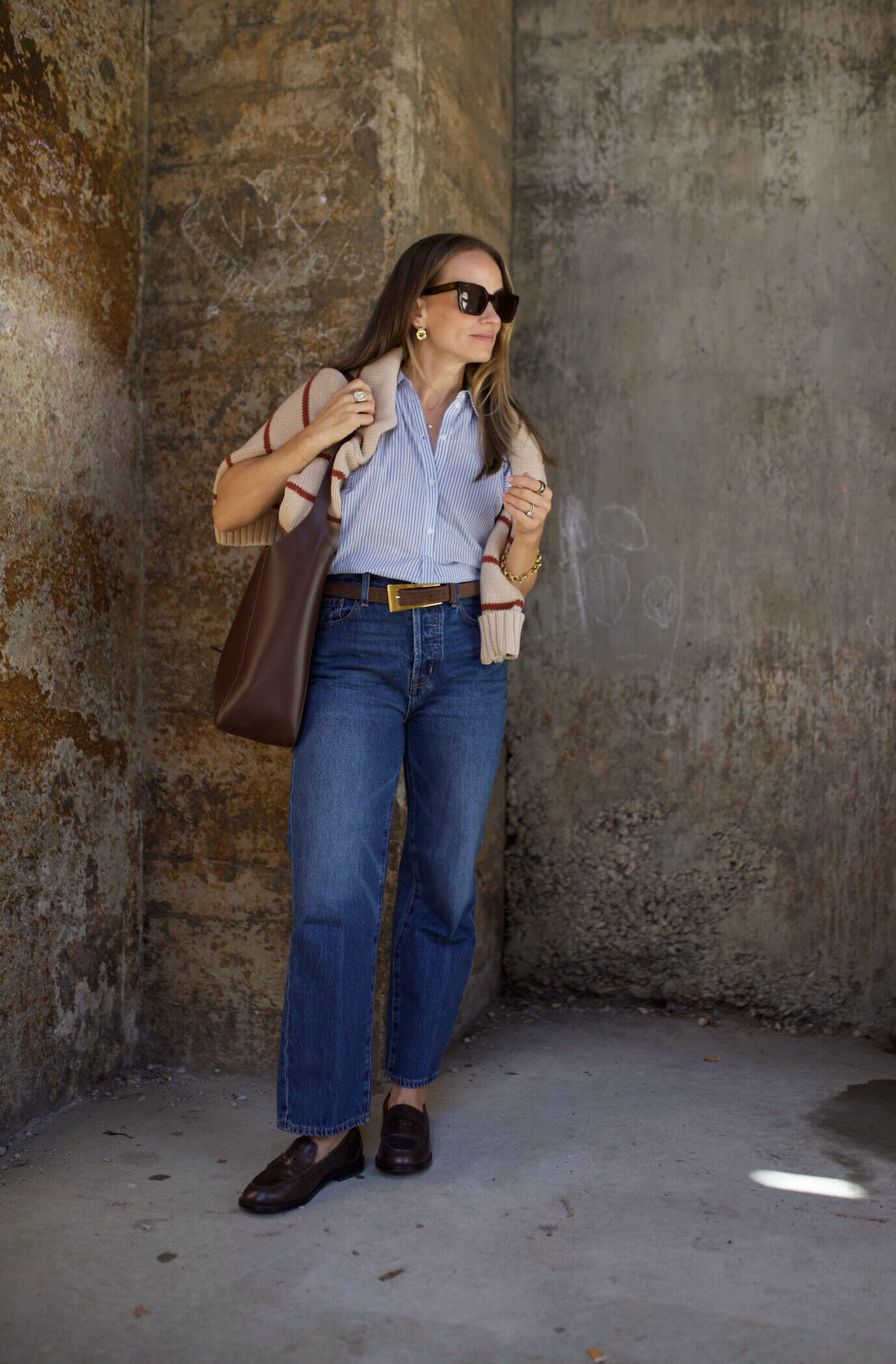 This is my signature outfit formula. Straight-leg jeans, a crisp button-down shirt, a cozy cardigan layered on top, and loafers at the ankle — it doesn’t get more classic. It works year-round, from black leather or chunky loafers in fall (see this year’s fall trends here) to suede loafers in spring (I’m wearing the Madewell suede penny loafers in the photos above). Swap the cardigan for a blazer and you’ve got instant business casual.